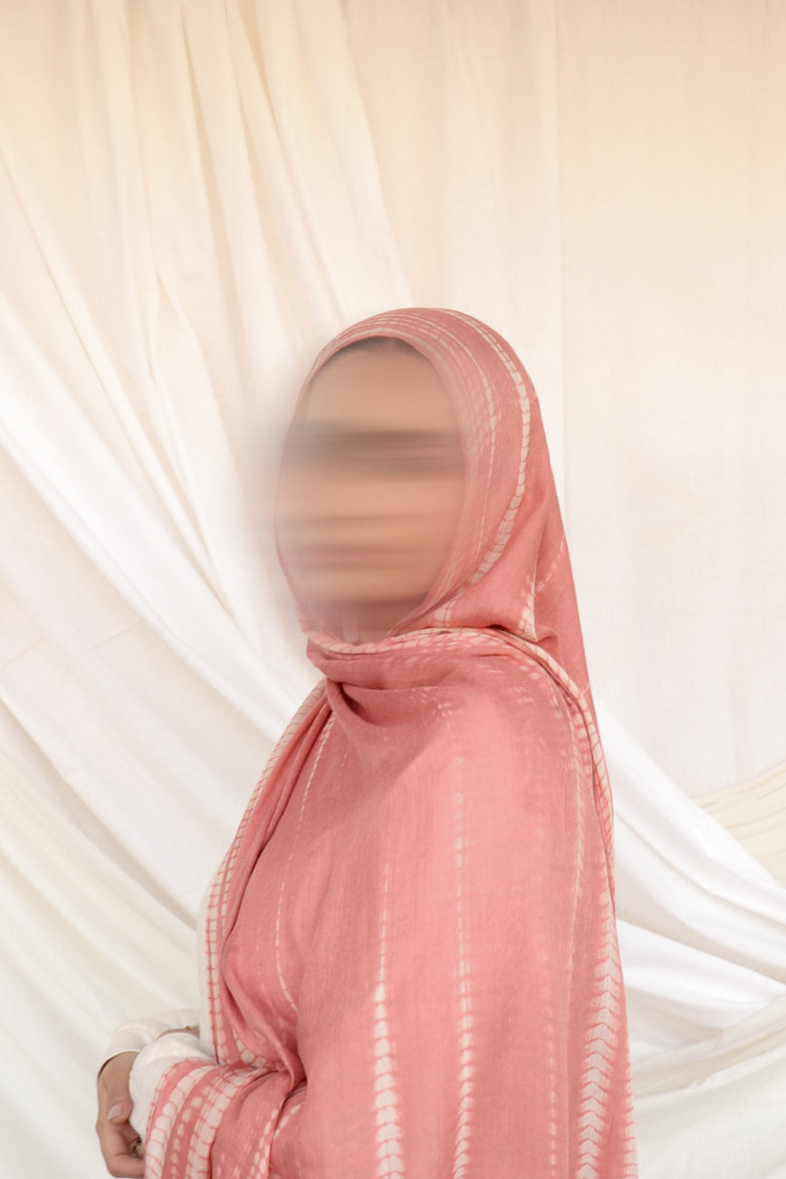 Introducing the Clay Ripple Hijab, an artistic and earthy addition to your modest wardrobe. This unique piece features a warm terracotta and dusty pink base, accented by soft, rippling waves of cream—a stunning hand-dyed pattern that mimics the natural flow of water over clay.